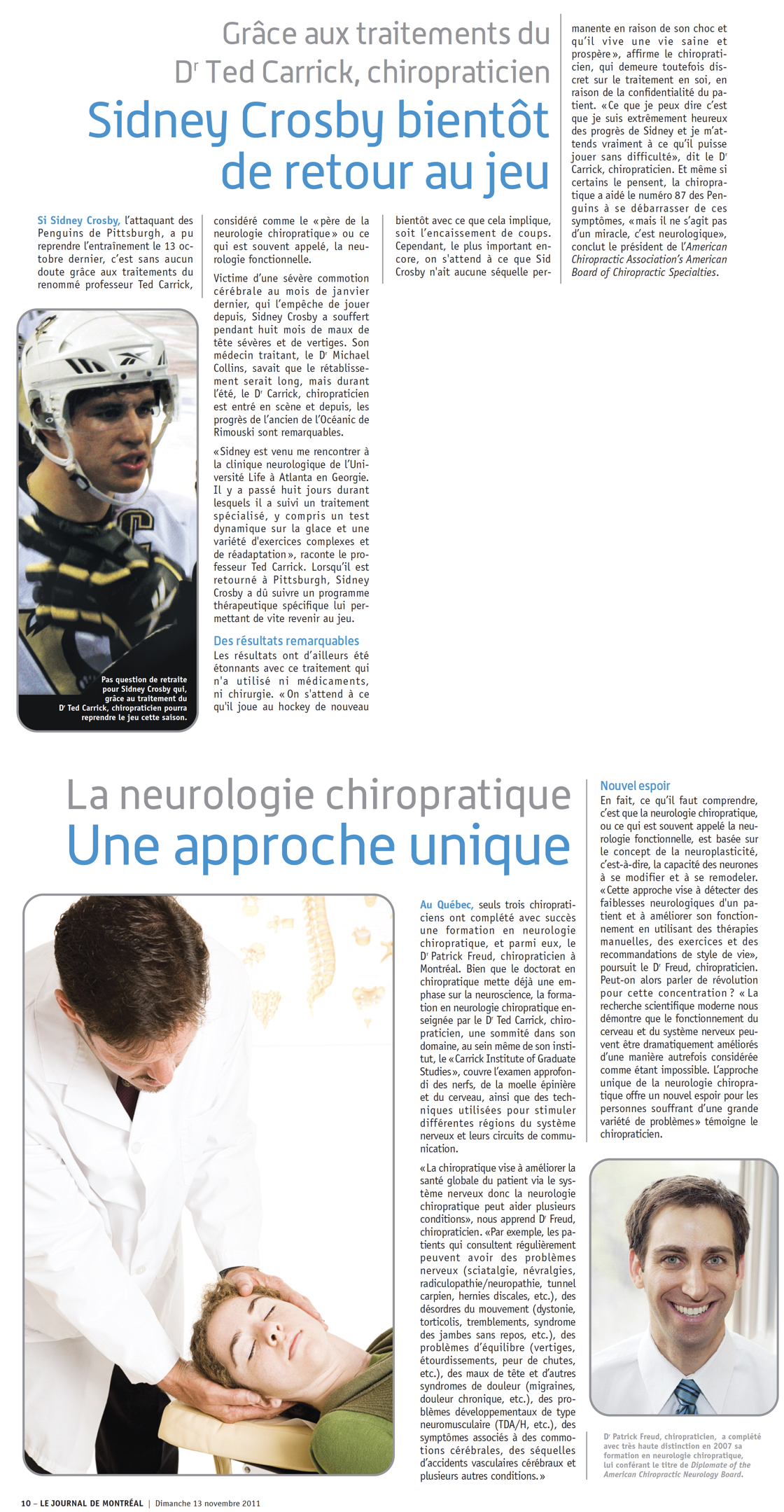 Article describing Sidney Crosby’s return to the NHL after suffering with concussion symptoms for over 8 months and Patrick Freud’s interview about Functional Neurology upon returning home after attending Crosby’s week-long evaluation and treatment.